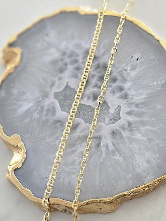 The mariner chain is a distinctive jewelry chain inspired by the heavy-duty anchor chains used on ships. It features oval-shaped links with a bar running through the center, creating a bold and structured look. This design not only enhances durability but also gives the chain a unique aesthetic appeal.